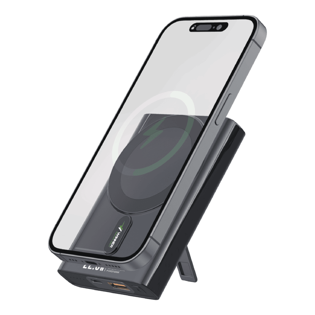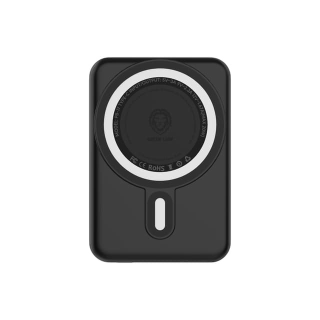 بنك طاقة بسعة تخزين 10,000 مللي أمبير/ساعة، بقوة شحن 22.5 واط، بسرعة فائقة وعمر طويل. يتميز بخاصية شحن آمنة وحماية من التيار الزائد. يدعم الشحن اللاسلكي MagSafe بقوة 15 واط. يحتوي على منفذ USB ومنفذين من النوع C. مزود بحامل، ويمكن حمله على متن الطائرات.